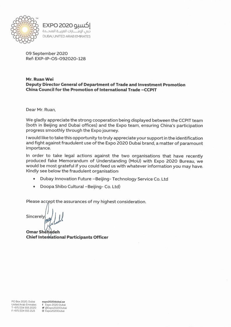 据反映,杜拜创新未来(北京)科技服务有限公司(Dubay Innovation Future - Beijing - Technology Service Co. Ltd)和杜拜世博文化(北京)有限公司(Doopa Shibo Cultural - Beijing - Co. Ltd)声称与2020年迪拜世博局签署谅解备忘录(见附件2),并进行迪拜世博会相关招商活动。经向迪拜世博局核实(见附件1),上述谅解备忘录系伪造。迪拜世博局表示将采取法律手段追责。