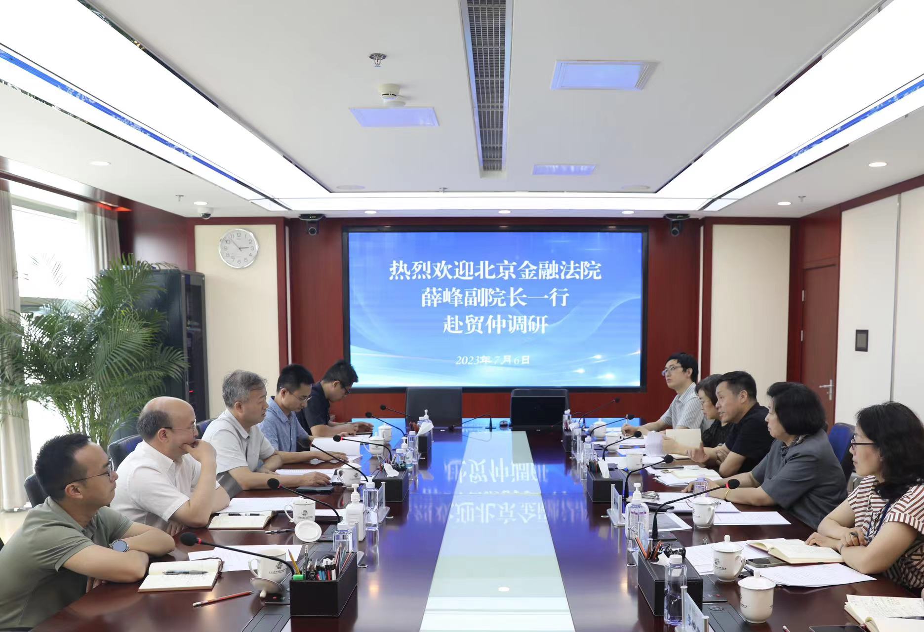 2023年7月6日下午,北京金融法院党组成员、副院长薛峰,执行局局长雷运龙一行到访贸仲,与贸仲副主任兼秘书长王承杰、副院长解常晴等就金融纠纷仲裁与司法执行协同治理机制相关问题进行座谈交流。