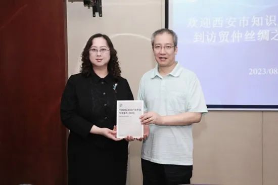 蒋红梅女士介绍了贸仲办案业务、知识产权保护与争议解决机制建设及调解工作机制,特别介绍了贸仲丝路中心与西安市中级人民法院西安知识产权法庭合作的“融解决”创新案例,并向李铨先生赠予《中国国际知识产权仲裁年度报告(2022)》。她期待双方充分发挥专业优势,汇聚优质法律资源,广泛调研企业需求,提升企业海外风险防范能力,不断探索推进仲裁-调解相对接的知识产权纠纷多元化解机制建设,助力西安打造知识产权保护新高地。