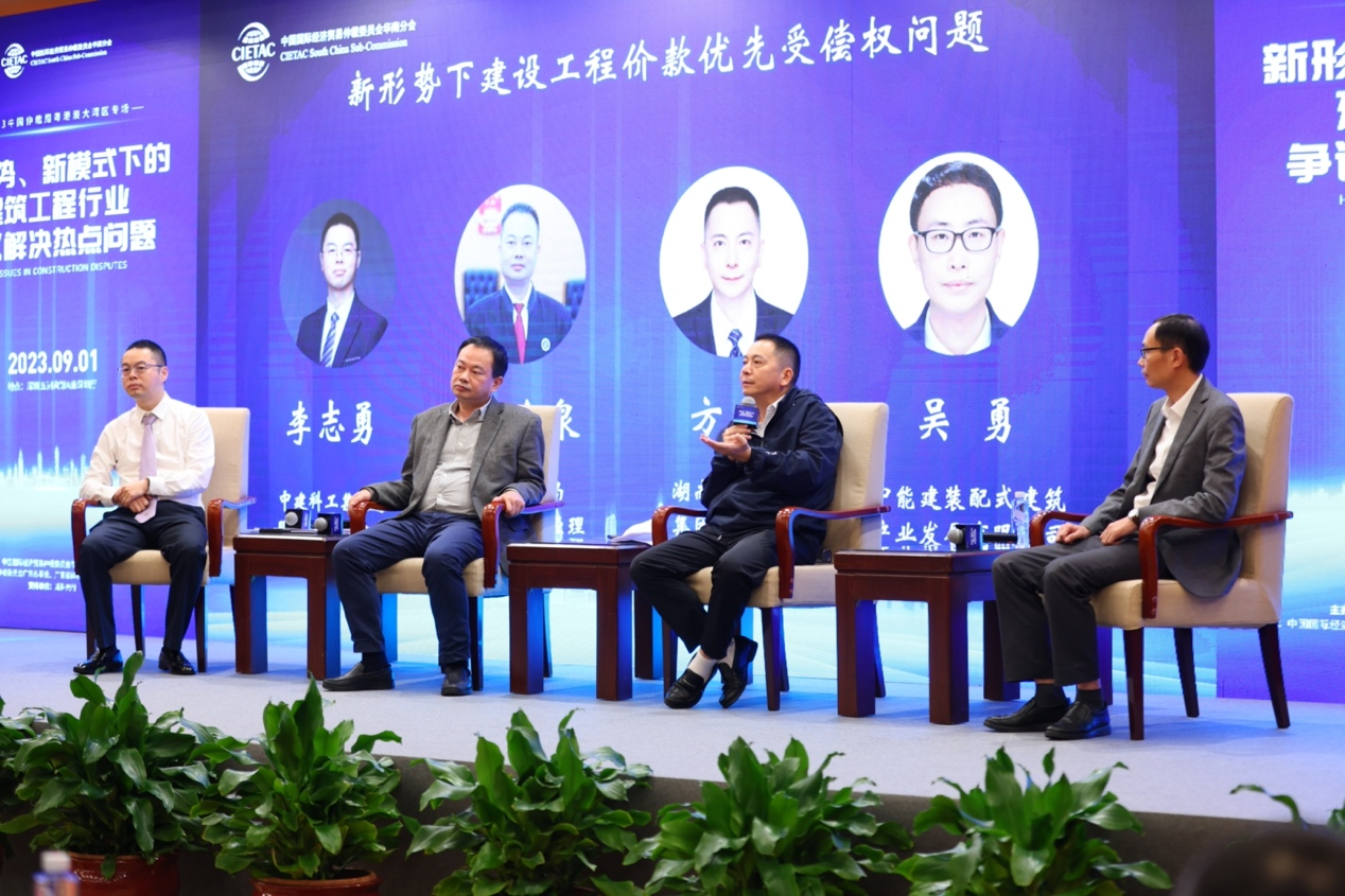 圆桌讨论环节围绕“新形势下建设工程价款优先受偿权问题”展开。由中建科工集团有限公司合约法务部总经理李志勇主持,中建五局法律部总经理李应泉、湖南建设投资集团有限公司总法律顾问、首席合规官方拯,及中能建装配式建筑产业发展有限公司副总法律顾问吴勇分别发言。各位嘉宾围绕“建设工程价款优先受偿权期限的起算时间,如发包人与承包人补充协议约定改变原合同付款条件后优先权的保护期限问题”“ 承包人放弃或限制建设工程价款优先受偿权的效力问题”以及“《最高人民法院关于商品房消费者权利保护问题的批复》施行后,承包人该如何采取措施保护建设工程价款优先受偿权”等问题展开热烈讨论,结合自身实务经验分享了不同的观点和见解。
