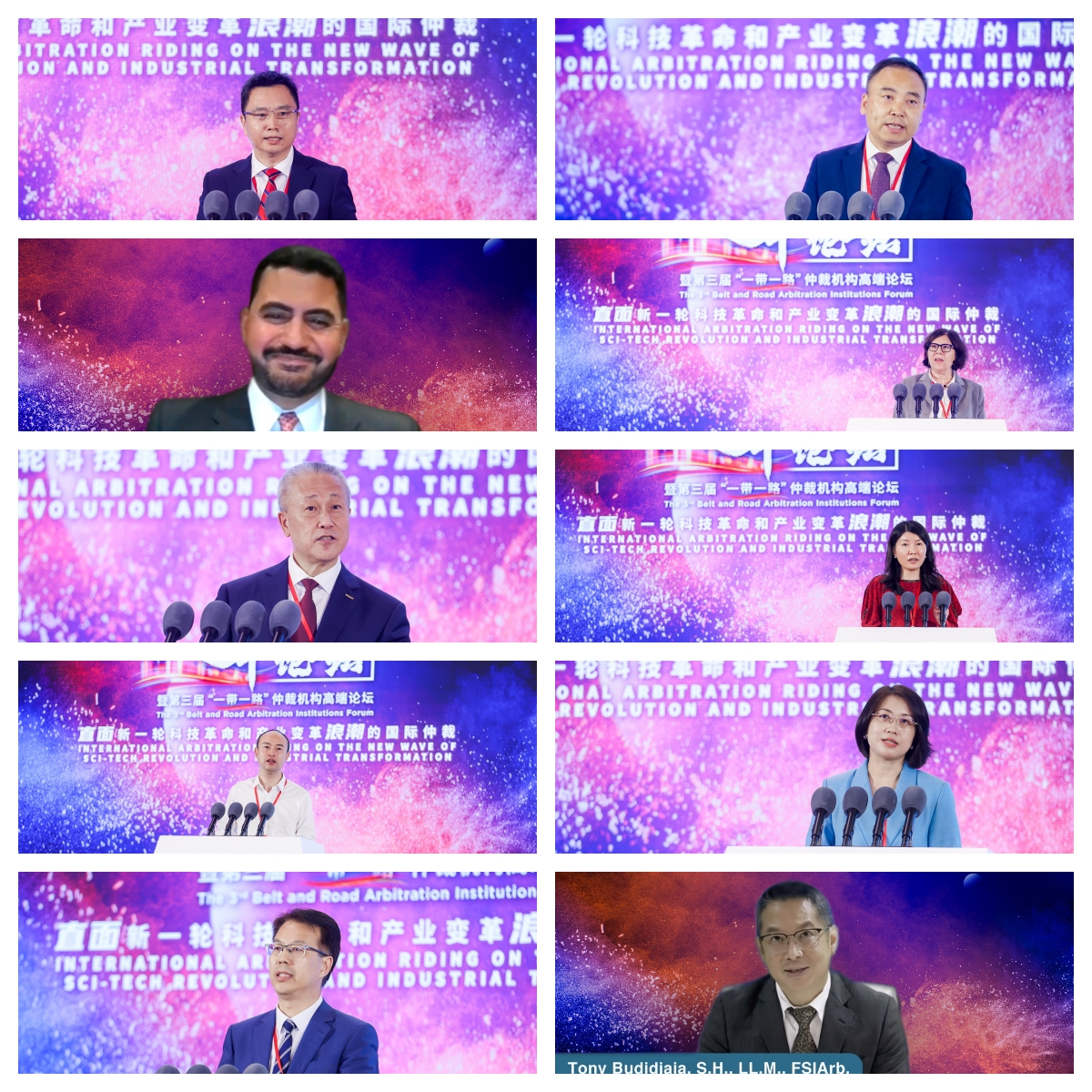 从左到右、从上到下依次为:中伦律师事务所高级顾问、贸仲仲裁员赵健,中国人民大学法学院副院长、贸仲仲裁员杜焕芳,英国伦敦玛丽女王大学国际法与公共政策讲席教授Malik R. DAHLAN,北京大学国际法学院常驻知名学者、贸仲仲裁员Susan FINDER,浙江吉利控股集团有限公司副董事长、贸仲仲裁员孙宏,北京电子控股有限责任公司总法律顾问、贸仲仲裁员王谨,阿里云智能集团副总裁屠剑威,威科集团全球增长市场副总裁、中国董事总经理王志霆,北京市盈科律师事务所高级合伙人、贸仲仲裁员王风和,印度尼西亚独立调解员和仲裁员协会(MedArbId)主席、贸仲仲裁员Tony BUDIDJAJA]