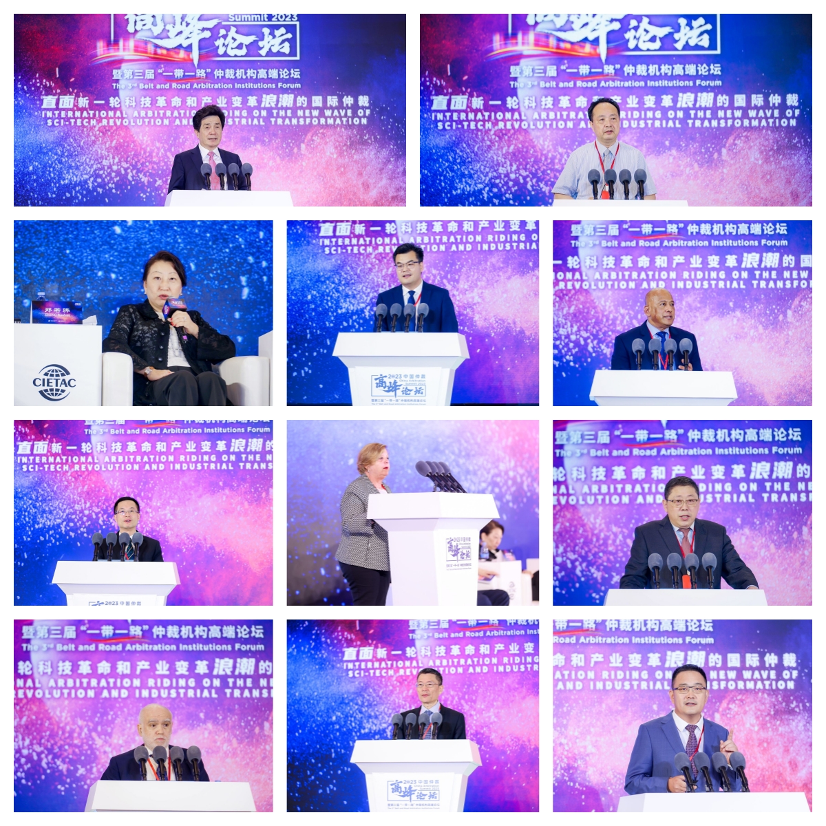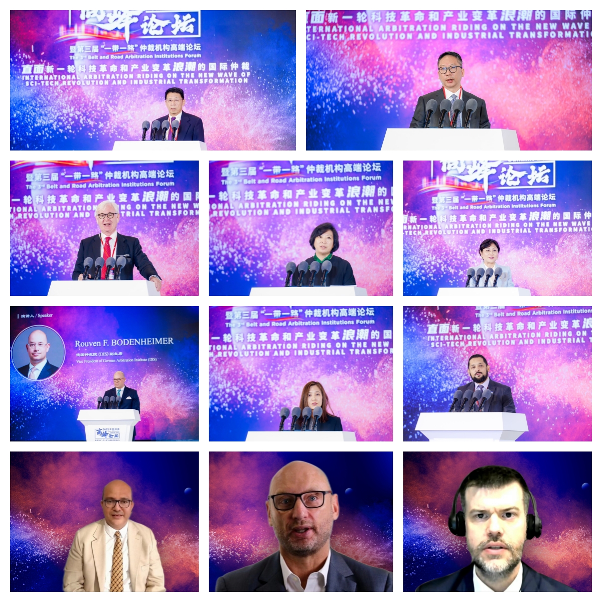 从左到右、从上到下依次为:国际投资争端解决中心(ICSID)调解员、外交学院教授、贸仲仲裁员卢松,香港国际仲裁中心(HKIAC)联合主席、香港特别行政区律政司前司长、贸仲仲裁员袁国强,维也纳国际仲裁中心(VIAC)主席、贸仲仲裁员Nikolaus PITKOWITZ,中国国际经济贸易仲裁委员会(CIETAC)仲裁院副院长解常晴,国际商会(ICC)国际仲裁院副主席、贸仲仲裁员师虹,德国仲裁院(DIS)副主席Rouven F.BODENHEIMER,新加坡国际仲裁中心(SIAC)首席执行官Gloria LIM,沙特商事仲裁中心(SCCA)首席执行官Hamed Hassan MERAH,开罗区域国际商事仲裁中心(CRCICA)主任、贸仲仲裁员Ismail SELIM,英国有效调解中心(CEDR)主任James SOUTH,巴西调解与仲裁中心(CBMA)首席执行官Daniel Brantes FERREIRA]