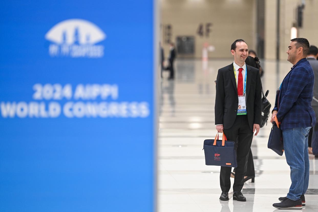 10月19日,参会人员行走在2024年国际保护知识产权协会世界知识产权大会会场内。新华社记者 江汉 摄