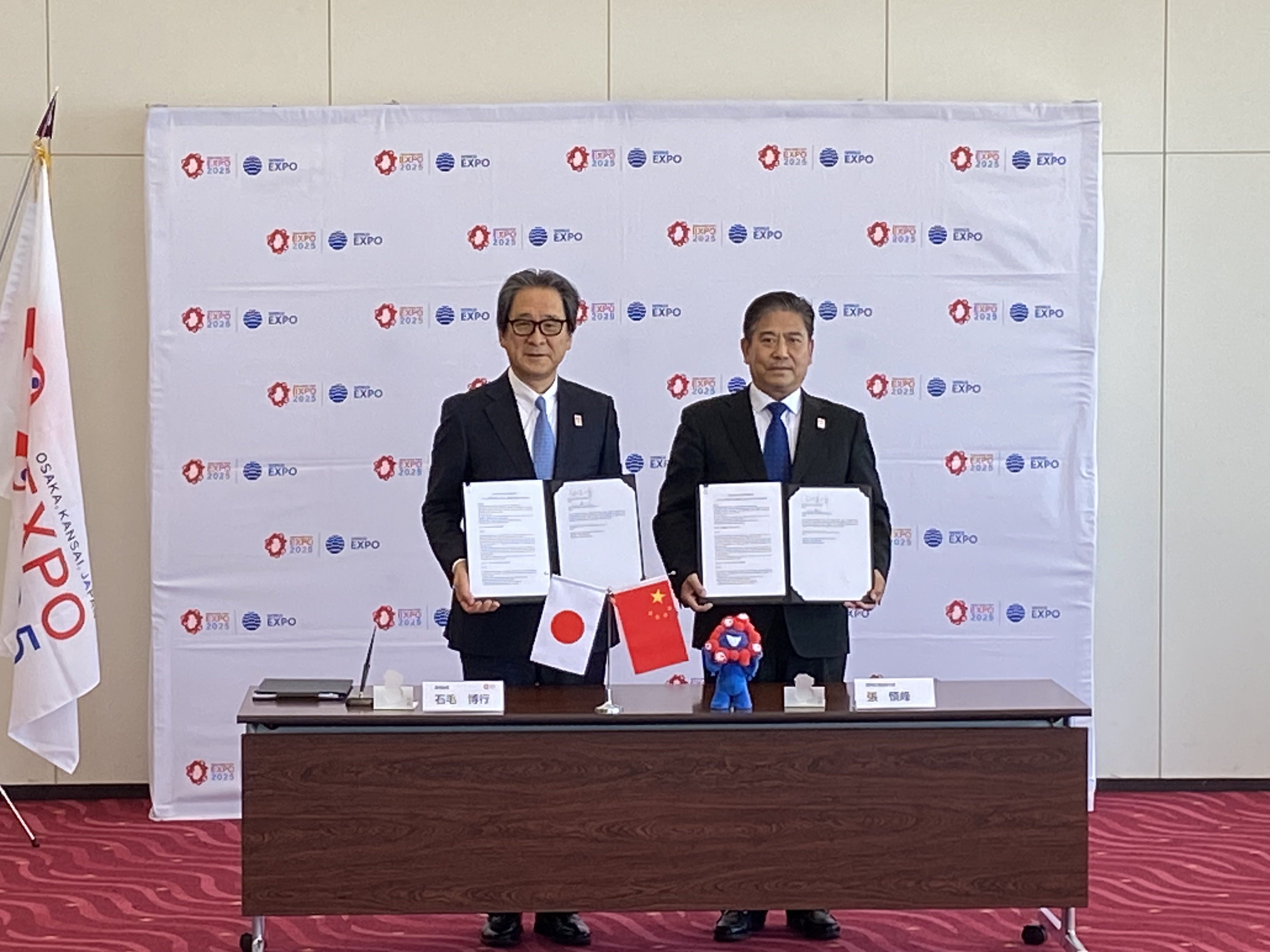 4月27日,2025年日本大阪世博会中国参展合同签约仪式在日本大阪举行。大阪世博会中国馆政府总代表、中国贸促会副会长张慎峰与2025年日本世博会协会事务总长石毛博行分别代表中日双方在参展合同上签字。中国驻大阪总领事薛剑参加签约仪式。