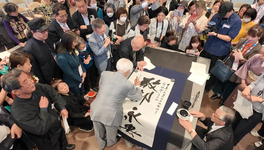 中日16位书法家围绕“和平、友好”主题,挥毫泼墨、切磋技艺、畅谈心得,携手合作完成了“山川异域、风月同天”“美美与共、天下大同”等4幅作品,表达了珍爱和平、共同发展的愿望,促进中外文化交流和民心相通。